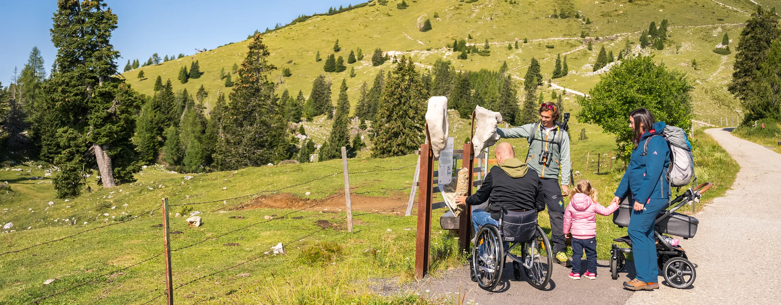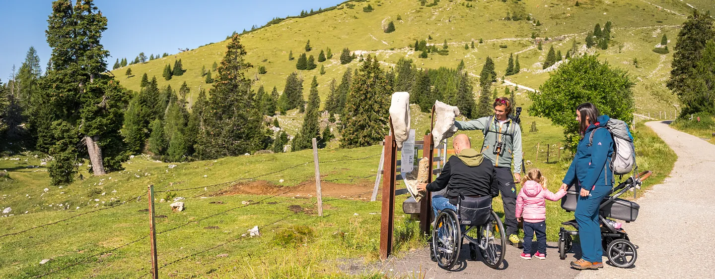 Then the Geo Learning Trail is just the job! At approx. 1732 m above sea level, at the so-called Rosstratte, which is also the start of the hiking path up to the summit, a top-class barrier-free learning trail has been created. Along it visitors can find out about, view and touch the different types of rock to be found in the Dobratsch Nature Park. A series of display boards provide information about the various deposits. And at the end there is a seating area for groups to rest awhile.