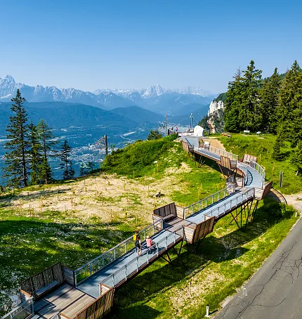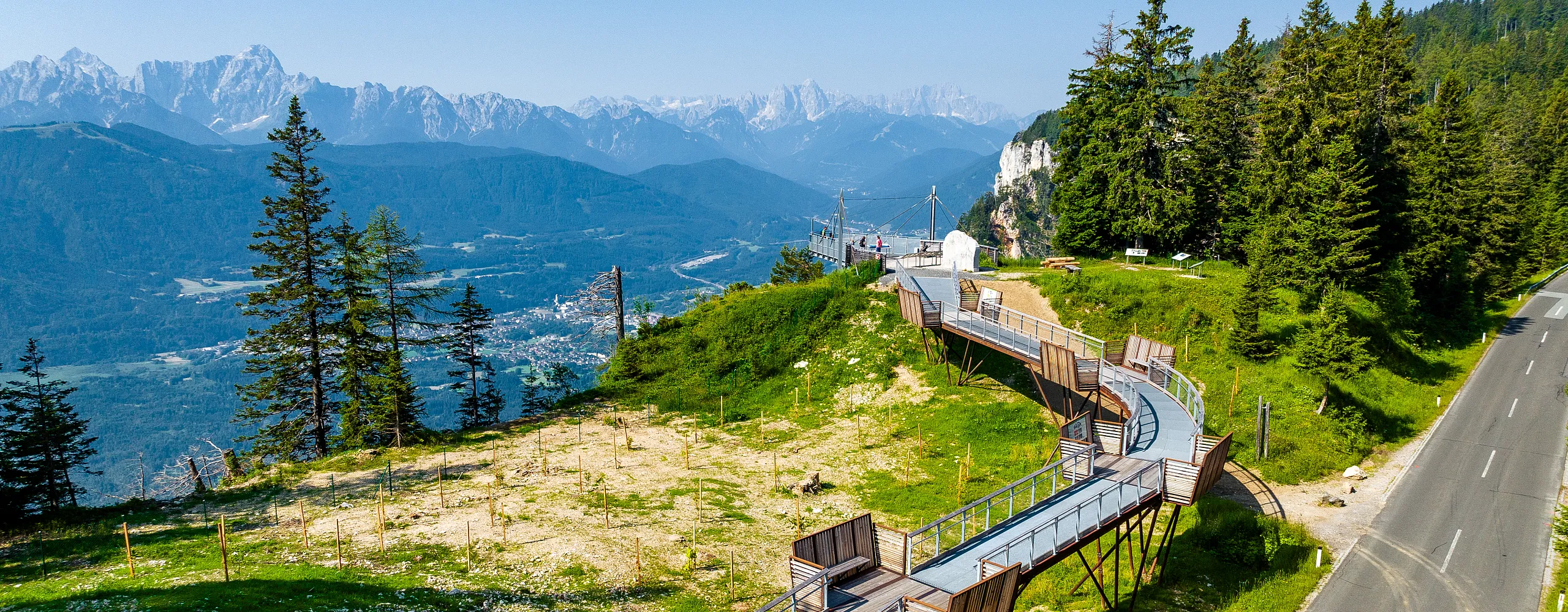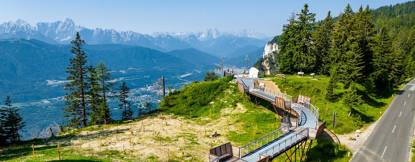 In unmittelbarer Nähe vom Parkplatz Nummer 6 befindet sich der Skywalk über die Rote Wand. Von dort bietet sich ein atemberaubender Blick auf die Karawanken und in das Gailtal. Weiter oben wartet die Aussichtsplattform Gamsblick auf die Wanderer.