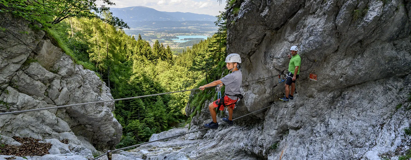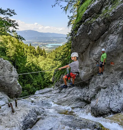 A breathtaking view opens up from the very first few meters. A rope bridge crosses the stream at a height of around six meters and offers a spectacular view of the turquoise-blue lake Faaker See. Continue to the second rope bridge, where you cross the stream again and approach the next section.